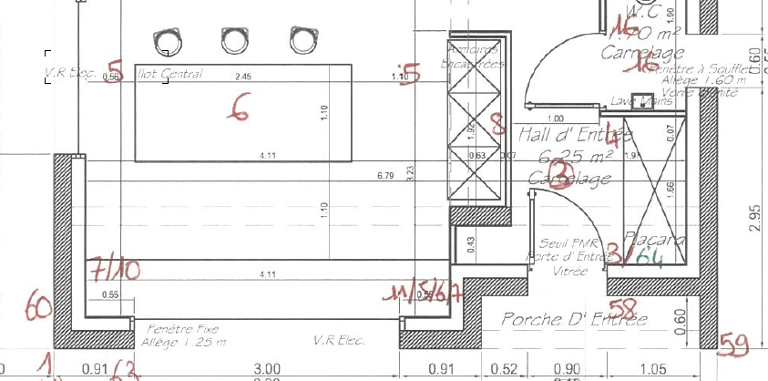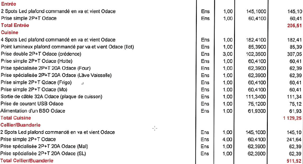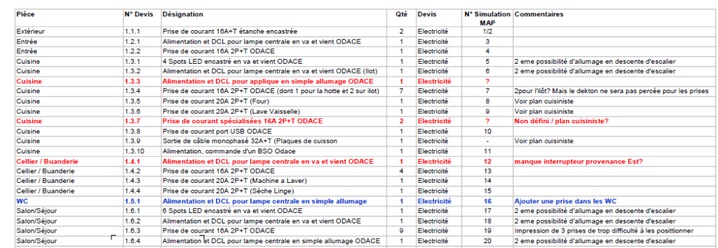 Pour définir notre plan électrique, nous avons fait 2 réunions de 2h environ avec co-me avant d’en refaire avec la société qui a géré notre électricité (3h). C’est une réunion qui peut être assez tendue, logique masculine vs logique féminine, il faut s’accorder sur ce qui doit être fait ou non, ce qui est important ou pas. Notre devis était assez bien fait à la base : chaque pièce était listée, ensuite toutes les installations et les tarifs, rien de confidentiel, tout était détaillé, nous n’avions pas de ligne de regroupement du type 10 prises électriques sans savoir quelle était la répartition. Nous étions en maîtrise d’œuvre, on avait aussi donc donné les prémisses de ce que l’on souhaitait, les détails de la cuisine ont été donné par le cuisiniste, de nombreuses choses ont été affinées au fur et à mesure des discussions.