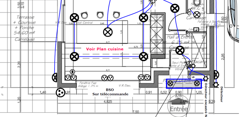 Nous avons matérialisé le tout sur les plans juste avec des numéros puis fait des équivalences avec ceux du devis ensuite l’électricien a refait avec les vrais symboles électriques avant la réunion. Ce qui nous convient ne conviendra pas à d’autres personnes, tout dépend aussi des besoins de chacun je vous donne quelques exemples :