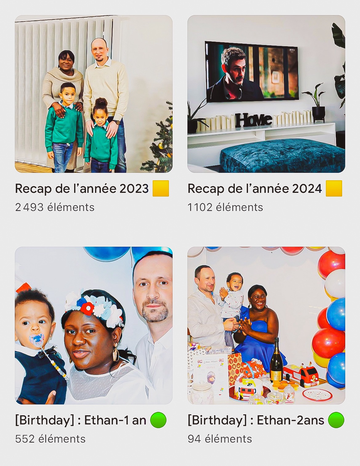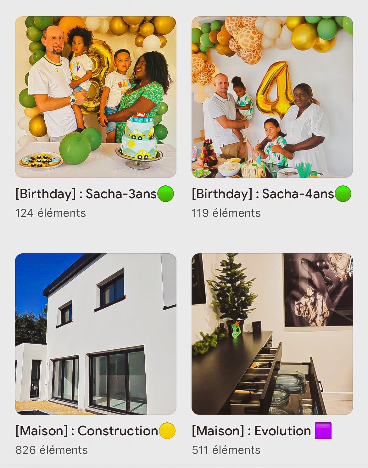 Mes grossesses, la naissance de mes enfants, leurs anniversaires, la construction de la maison, les voyages etc.. sont les moments clés de ma vie, si vous vous lancez vous devez vous poser la même question et adapter à votre vie / vos photos/ vos moments clés. Pour les autres catégories, Google crée ou suggère fréquemment, des thématiques par exemple mer, plage, nourriture ou même d’identifier les visages pour faciliter les recherches. je n’ai donc pas juger utile de créer d’autres albums que ceux faits et cités plus hauts.
