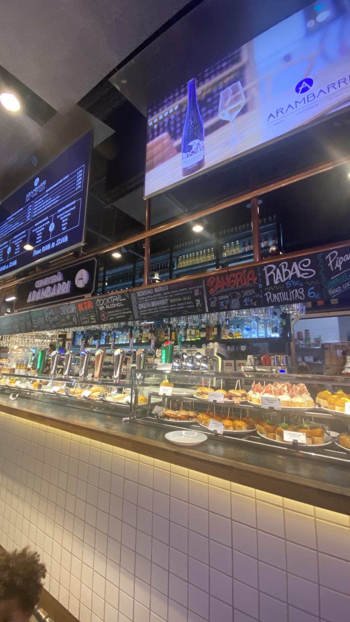 – déjeuner au Ribera Market : le bâtiment intègre 2 concepts le marché de produits locaux et alimentaires, c’est le plus grand marché couvert d’Europe et inclut aussi un food court du même style que le Time outlet market à Lisbonne, il y’a plusieurs stands alimentaires divers et variés, on choisit ce que l’on souhaite manger, on paye et on s’installe là où on trouve de la place puis on mange. Les places et la vaisselle sont communes à tous les stands et sont gérées par une équipe spéciale.
