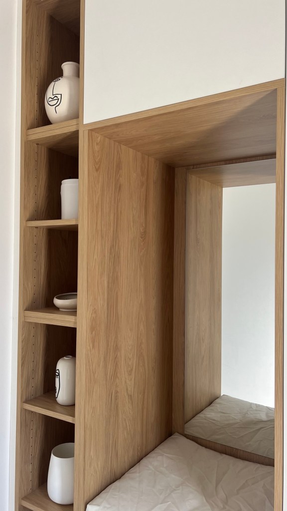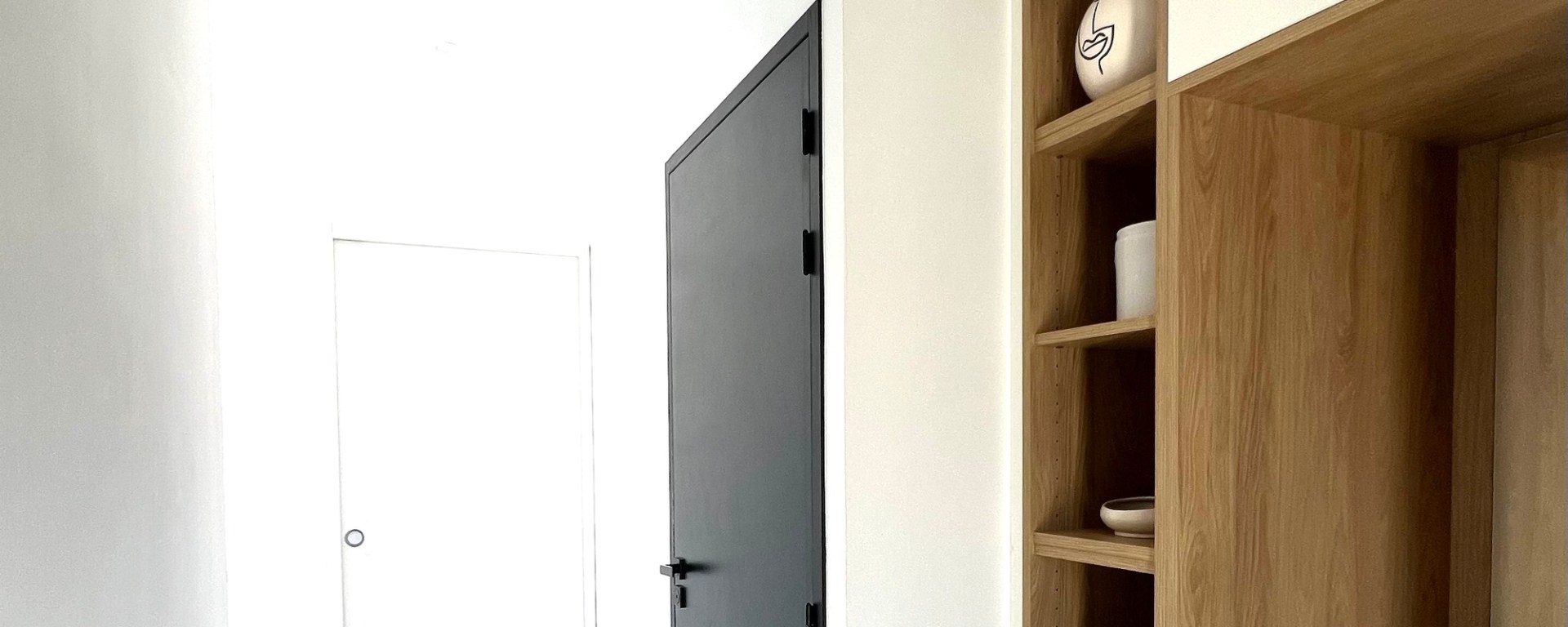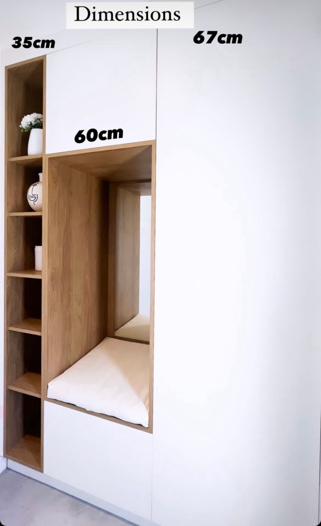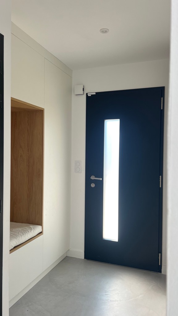 Elle a été faite sur mesure par un artisan menuisier (AVL à Plouvorn lien ici). Elle a adaptée aussi à l’environnement les plombiers ont eu la bonne idée d’y mettre toute l’installation qui sert à couper l’eau de façon centralisée donc il fallait s’adapter et laisser tout cela accessible en même temps. On a choisi un design blanc / bois pour emmener de la clarté à l’entrée car le noir aurait assombrit.