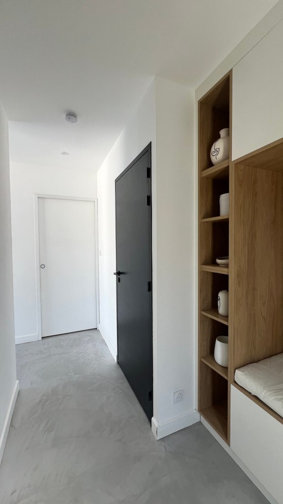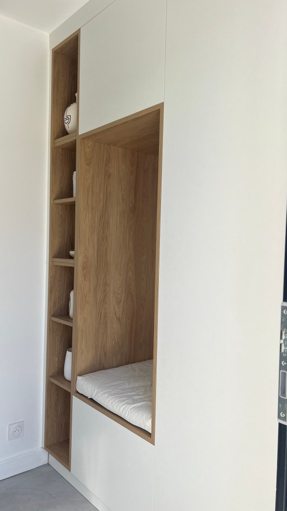 Notre entrée a été réduite pour faire place aux colonne de cuisine de l’autre mais on a réussit à avoir quand même quelque chose qui me plaît: une mini bibliothèque à gauche, un placard d’entrée avec une colonne pour les manteaux, 2 caissons étagères grande capacité, 1 grand tiroir pour mettre les sacs d’école and co, 1 étagère interne dans la colonne manteaux et une colonne toute hauteurs de niches / étagères pour de la décoration.