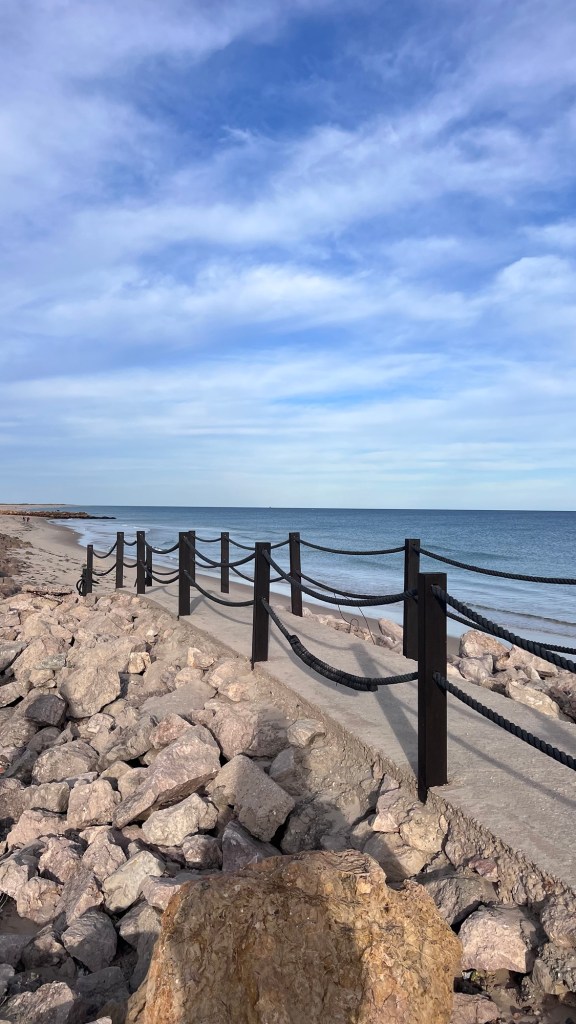 Après la pause, nous avons longé le passage José Roque Junior: balade très agréable on y voit les bateaux en retour de sortie mer, le train qui va et vient de la gare de Faro, on entend de la musique des rooftop qui sont à proximité, il y’a des bancs pour se poser, des cabanes anciennes à admirer. De quoi profiter du spectacle approchant du coucher de soleil.