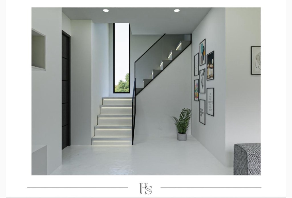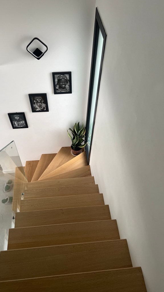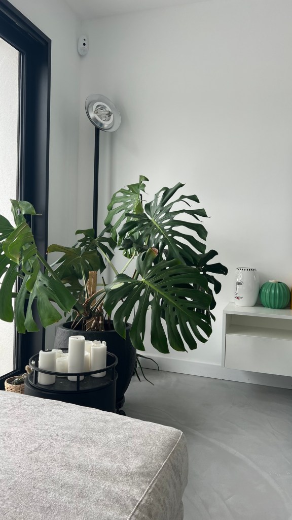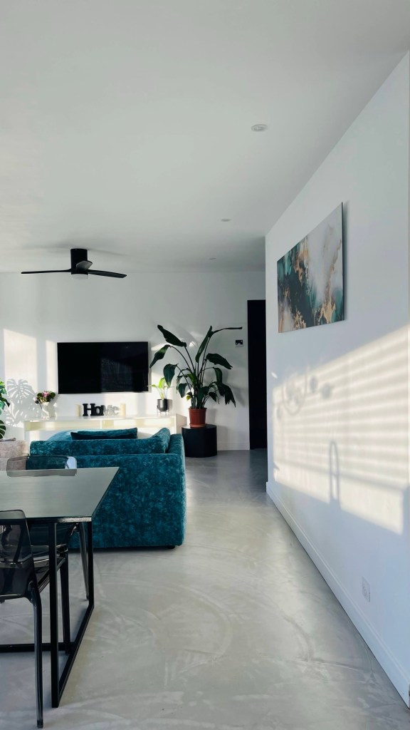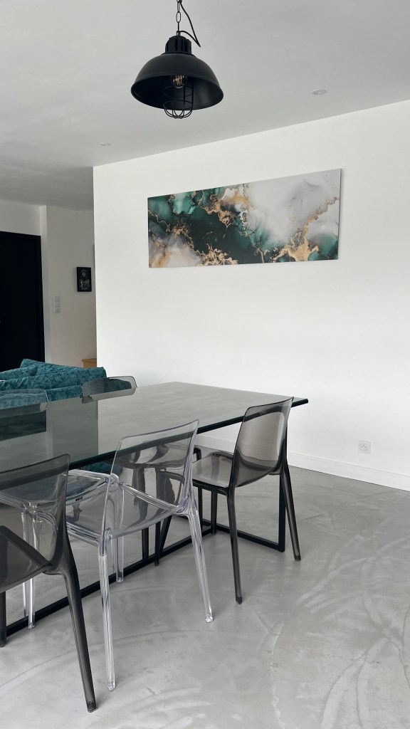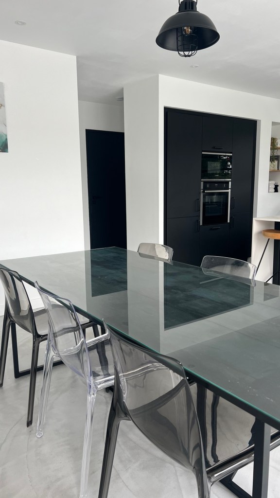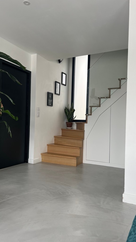C’est donc une pièce en un seul bloc qui englobe la cuisine (article détaillé disponible sur le blog), le coin repas/ salle à manger et le salon/ séjour. La pièce de vie délimite aussi la zone jour de la zone nuit côté escalier on a en plus une surface d’environ 3,05m2 qui abrite l’escalier et le sous escalier qui fait office de placard / zone de stockage. Le sol est en béton ciré gris clair taloché avec des nuances. Tout comme tout le rez de chaussée, il est doté d’un chauffage au sol.