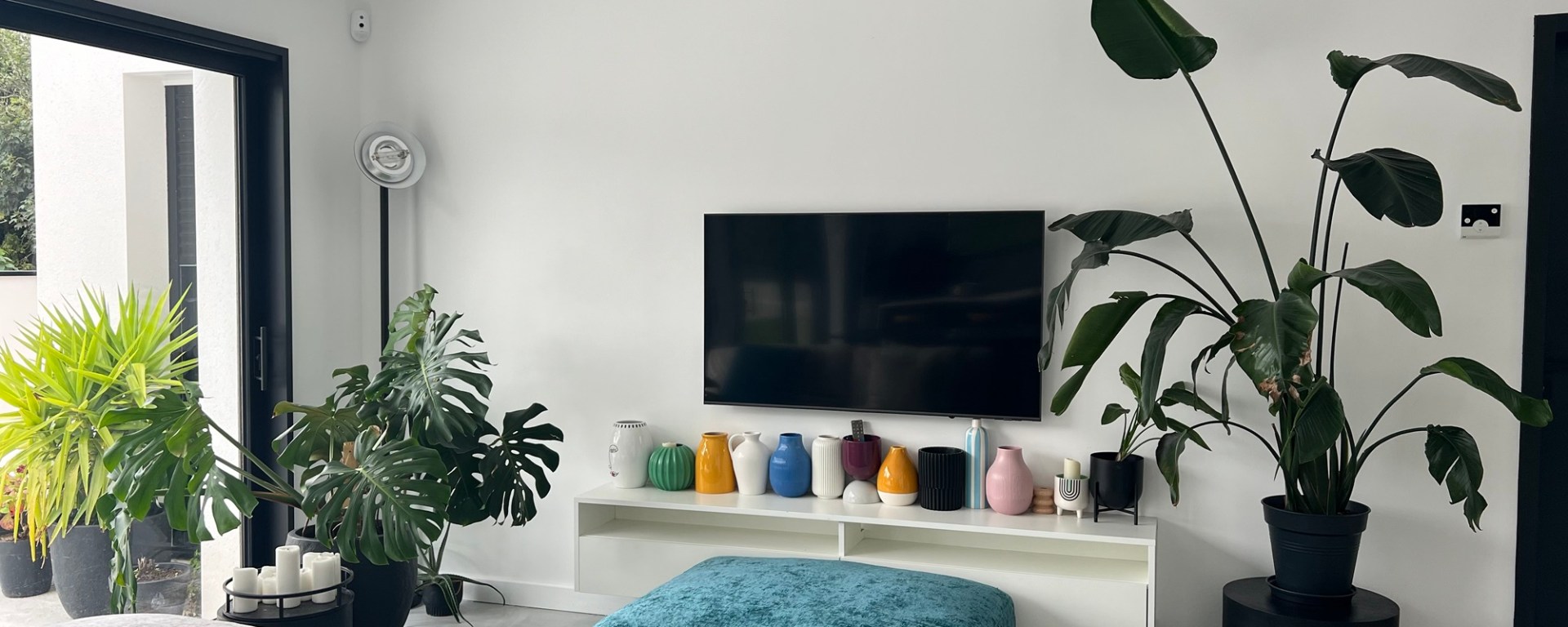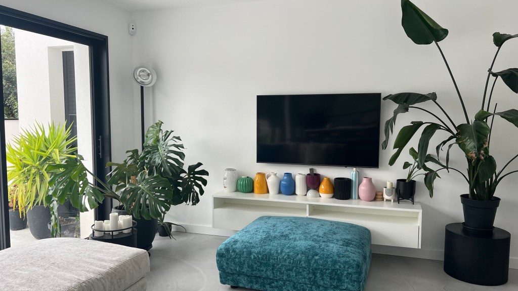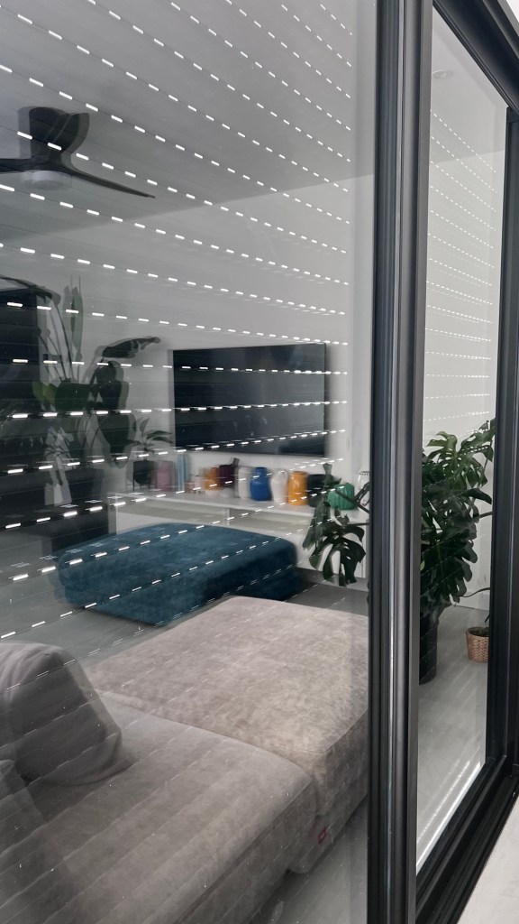 C’est une pièce lumineuse car tous les murs côté extérieur sont ouverts (exposition sud et ouest). La pièce de vie fait environ 42,05m2, avec 2 grandes ouvertures de 3,50m chacune orientée ouest face à la piscine, ce sont des volets roulants, côté cuisine il y’a une fenêtre panoramique de 3m x 0,90m avec un système de Brise Soleil Orientable, nous avons fait ce choix car cette fenêtre est exposée sud et j’avais peur des reflets sur la TV qui est en face au fond de la pièce.