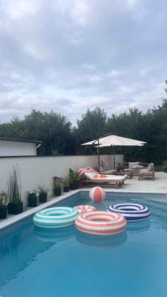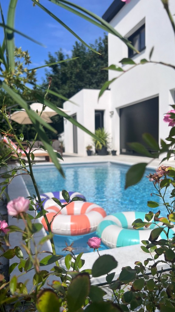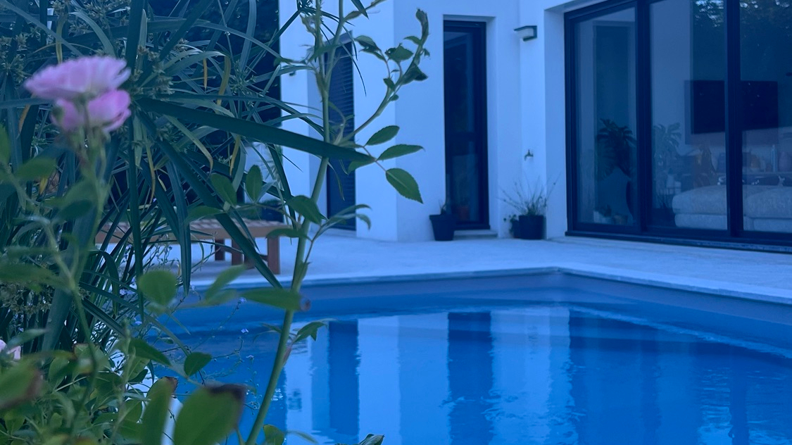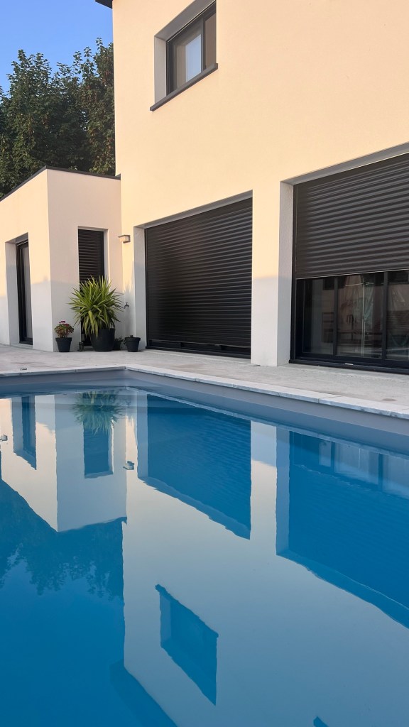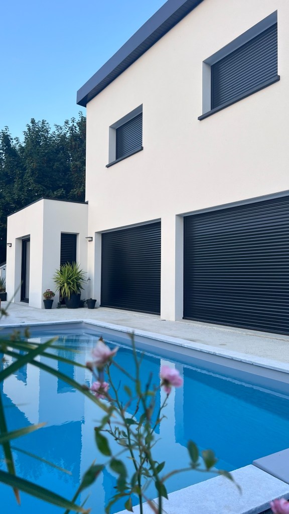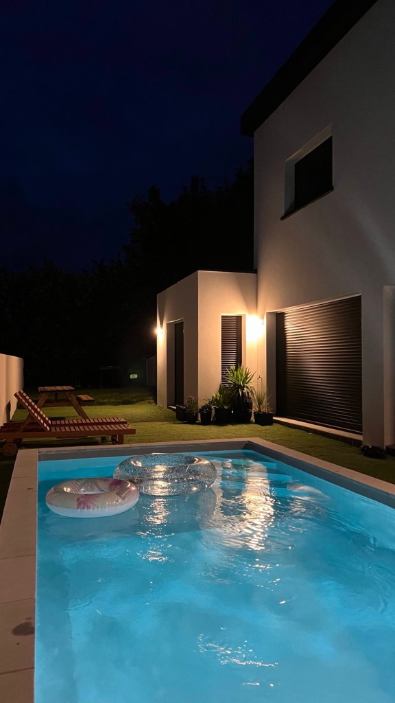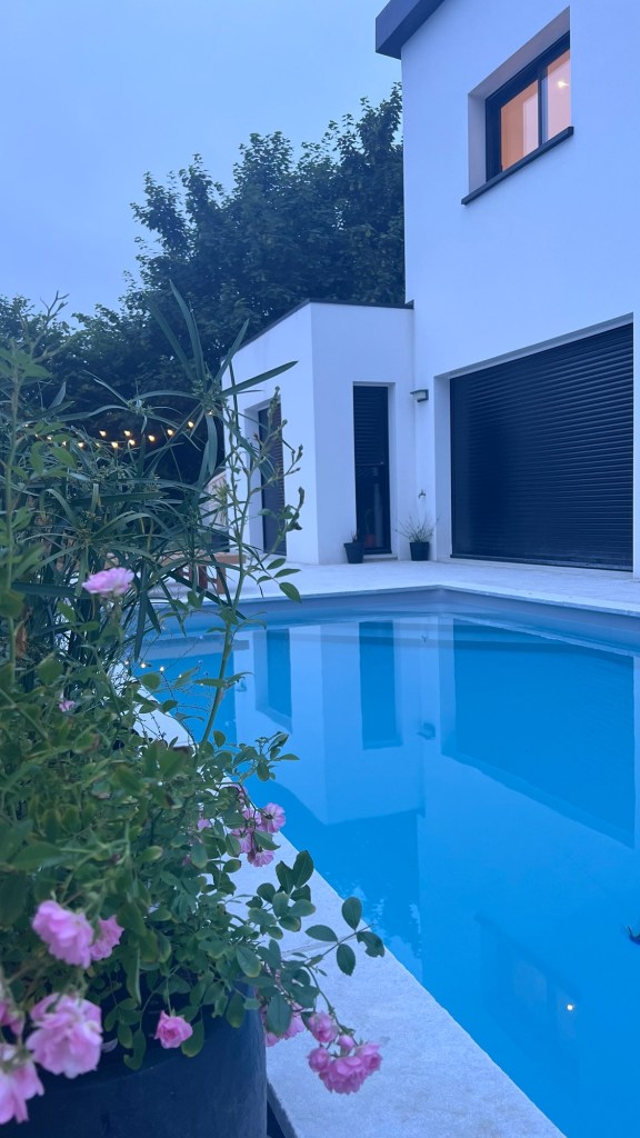 Concernant la protection de la piscine, nous avons choisi la bâche à barre parce que ça coûte moins cher qu’un volet roulant mais aussi c’est moins galère en terme d’entretien et pas de dépendance (blocage en cas de panne électrique etc..). S’il fallait faire un choix esthétique, je n’aurais rien mis car je préfère les piscines non encombrées mais la sécurité oblige. Le coût global de la piscine, chauffage et terrassement inclus s’élève à 28k€.