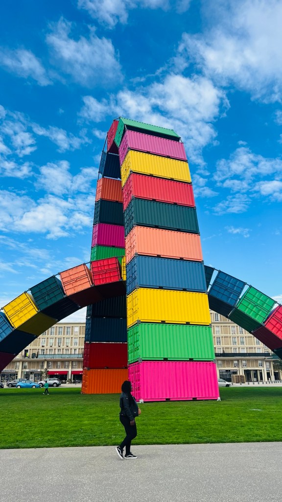 Notre première journée au Havre a été riche en découvertes. Nous avons commencé par le monument des soldats Havrais et la victoire de la France, un lieu empreint d’histoire, puis nous avons admiré l’architecture moderne du Volcan, conçu par Oscar Niemeyer. Ensuite, direction la carène des containers, créée en 2017 par Vincent Ganivet pour marquer le 500e anniversaire du port. Elle s’inscrit dans le cadre du festival « Un été au Havre », qui a lieu tous les ans depuis 2017 et qui permet à des artistes d’exposer leurs œuvres. Après, nous sommes revenus visiter vers la Cathédrale Notre-Dame, avec ses magnifiques vitraux et son atmosphère apaisante. Nous avons trouvé à proximité une pâtisserie qui fait des sandwichs, des pizzas c’est là que nous avons déjeuné. Ventre plein, Nadia contente donc direction les quais et la passerelle du bassin de commerce pour avoir la vue des 2 côtés des quais, il faisait beau et aux alentours on trouve des bancs pour faire une petite pause.