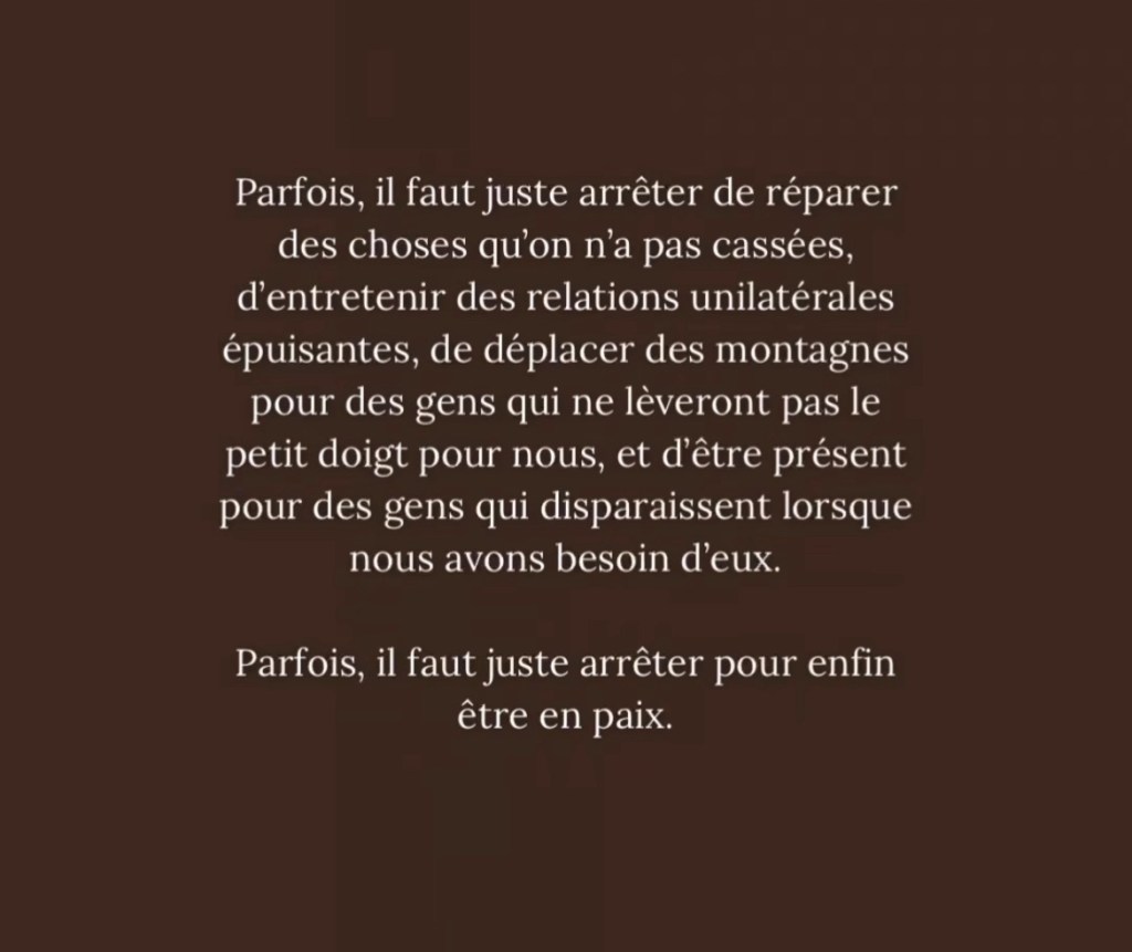 Ce n’est pas égoïste d’abandonner quelqu’un après lui avoir dit mille fois que son attitude vous blessait. Je pense qu’on ne parlait plus clairement la même langue donc j’ai passé du temps à traduire mon âme. Et puis pardonner et avancer avec une personne qui crée des vibes négatives et ne s’excuse pourquoi pas ?