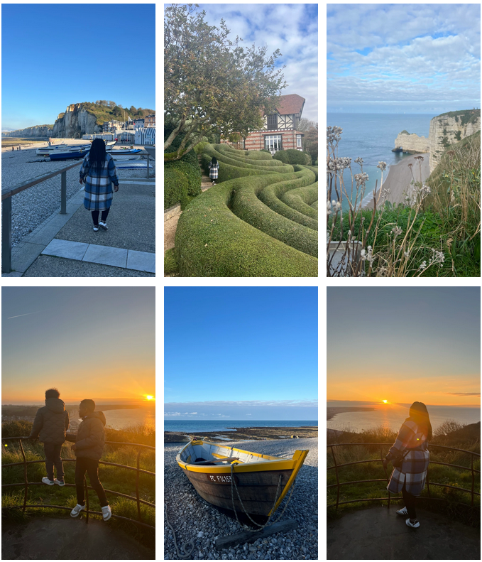 On quitte notre hôtel direction Étretat, nous nous sommes garés sur le parking principal du village. On a repéré sur Google le restaurant les Flottilles qui n’est pas sur réservation mais il était complet dedans et dehors, il ouvre à 12h et il était 12h15. Le restaurant d’en face était complet aussi lui fonctionne sur réservation, nous sommes rabattues sur le restaurant Le clos de lupin, pas de menu enfant, fonctionne également uniquement sur Menu soit entrée + plat/ plat à 27€ + dessert ou les 3 à 32€ mes enfants ne finissent pas les plats sauf si nuggets pâtes en général on prend donc un seul plat et si ça plaît on rajoute un second, ici ce n’était pas possible si vous êtes 4 vous prenez d’office 4 menus pas le choix, la dure loi du commerce dans les zones touristes ! Pas le choix de toute façon tout est complet aux alentours ils le seront aussi. Après le restaurant, les jardins d’Étretat, on y accède à pieds après 15 minutes de marche à partir du parking il n y en a pas sur place, Après les jardins directions les falaises d’amont   et Jardin 25€ pas de chèque vacances, Puis retour à la plage.