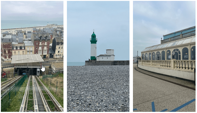 Après notre excursion en funiculaire, nous avons pris la direction de la porte Jacques Sorre, arrivant sur l’esplanade des maires du Tréport sur la plage et la promenade Bruno Garraud, Nous avons fait le tour de la plage à pied, profitant des aménagements en bois qui facilitent la marche sans avoir à marcher sur les galets. Au bout de la plage, nous avons découvert un phare, ainsi que des restaurants et un manège pour les enfants en remontant côté rue. Enfin, nous avons passé par la poissonnerie et la place du marché, complétant ainsi notre belle journée.