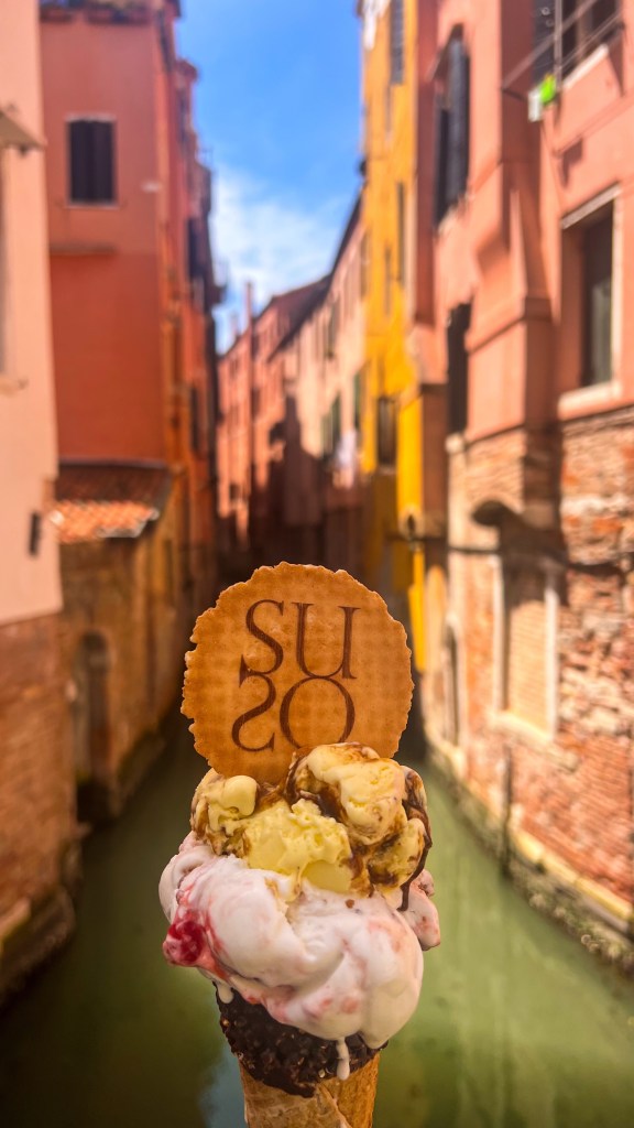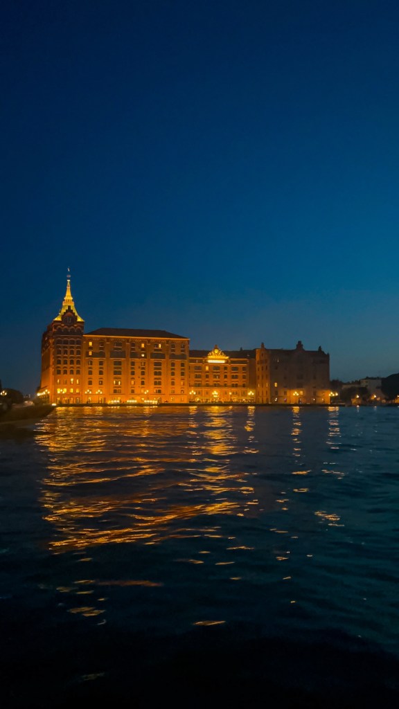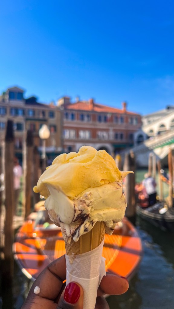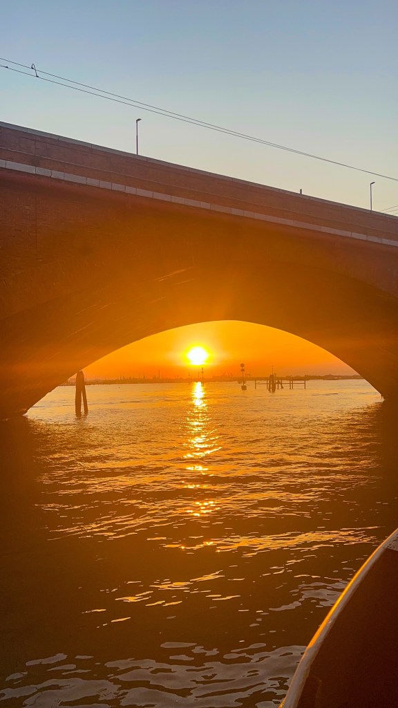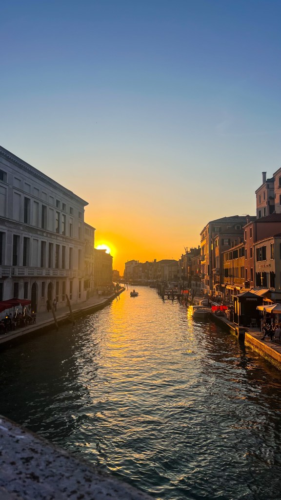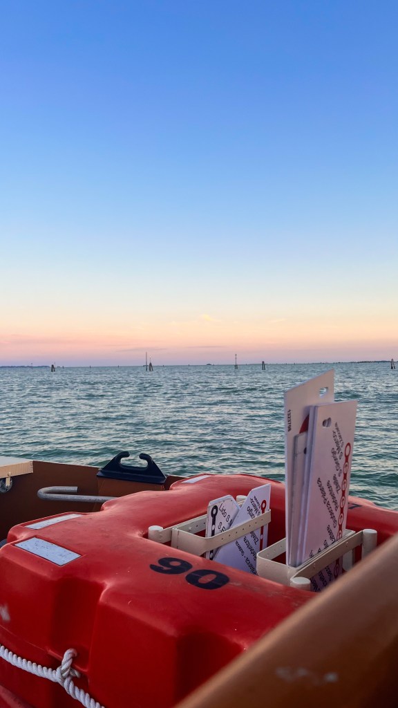 Après le restaurant, retour à l’hébergement à pied et pause glace chez Suso Gelatoteca, la queue est longue mais ça en vaut la peine. Vers 14h, grande pause à l’hôtel. Nous sommes sortis vers 19h pour profiter des lumières dorées et vivre le second sunset Vénitien, cette fois nous avons pris le bateau Ligne 2 et nous avons fait le tour et c’était magnifique : le vaporetto passe par plusieurs autres îles et rien que le passage du pont après la Piazzale de Roma est super, j’ai aimé. Après ce magnifique spectacle, nous avons dîné tard dans le même restaurant que la veille Al Cinema, on ne change pas l’équipe qui gagne, leurs pizzas sont très bonnes. Si votre gourmandise n’a pas de limite comme la nôtre, vous pouvez vous offrir une pause glace comme nous chez Amorino pas très loin, à 23h 🥹💁🏽♀️. Puis il est temps d’aller dormir, demain est un autre jour avec un réveil tôt.