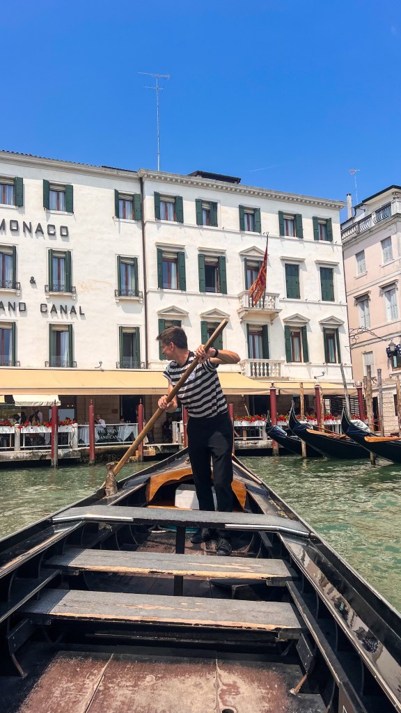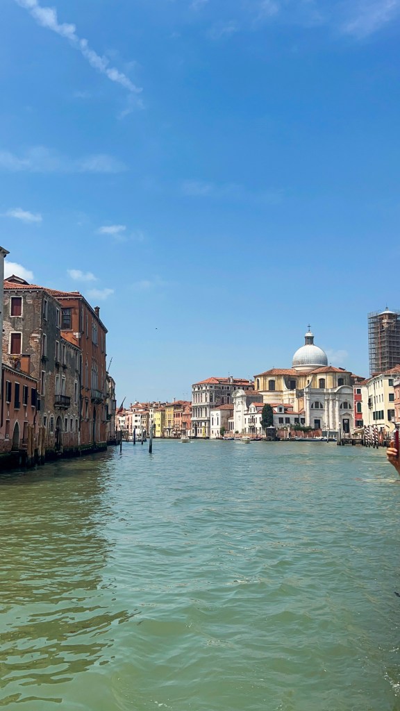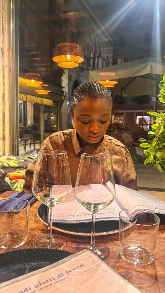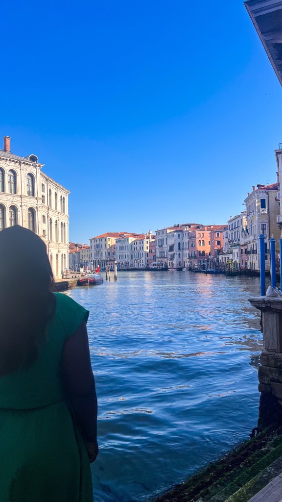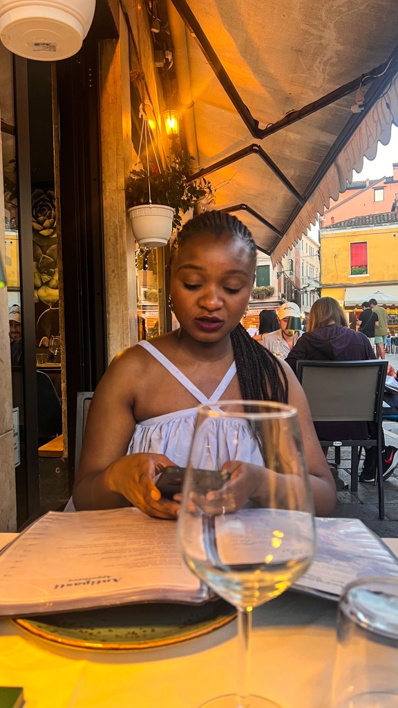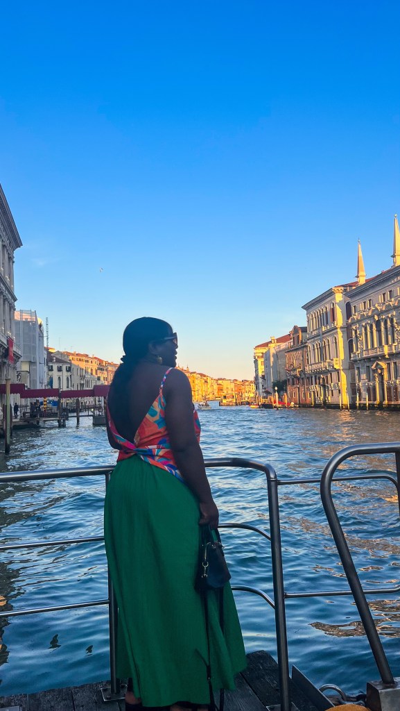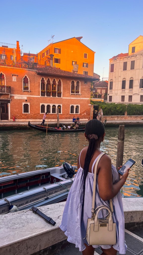 Après le restaurant, retour à l’hébergement à pied et pause glace chez Suso Gelatoteca, la queue est longue mais ça en vaut la peine. Vers 14h, grande pause à l’hôtel. Nous sommes sortis vers 19h pour profiter des lumières dorées et vivre le second sunset Vénitien, cette fois nous avons pris le bateau Ligne 2 et nous avons fait le tour et c’était magnifique : le vaporetto passe par plusieurs autres îles et rien que le passage du pont après la Piazzale de Roma est super, j’ai aimé. Après ce magnifique spectacle, nous avons dîné tard dans le même restaurant que la veille Al Cinema, on ne change pas l’équipe qui gagne, leurs pizzas sont très bonnes. Si votre gourmandise n’a pas de limite comme la nôtre, vous pouvez vous offrir une pause glace comme nous chez Amorino pas très loin, à 23h 🥹💁🏽♀️. Puis il est temps d’aller dormir, demain est un autre jour avec un réveil tôt.