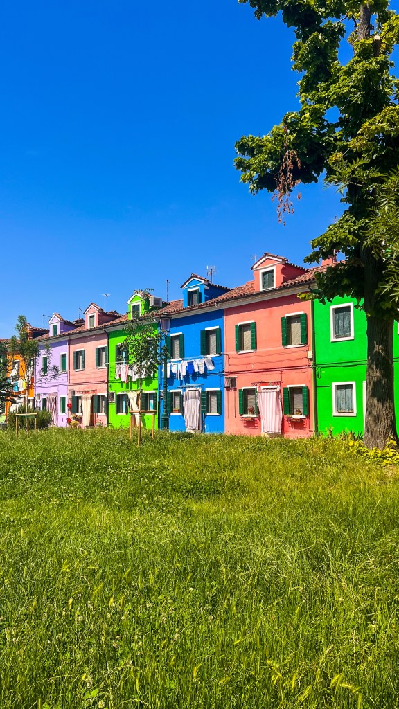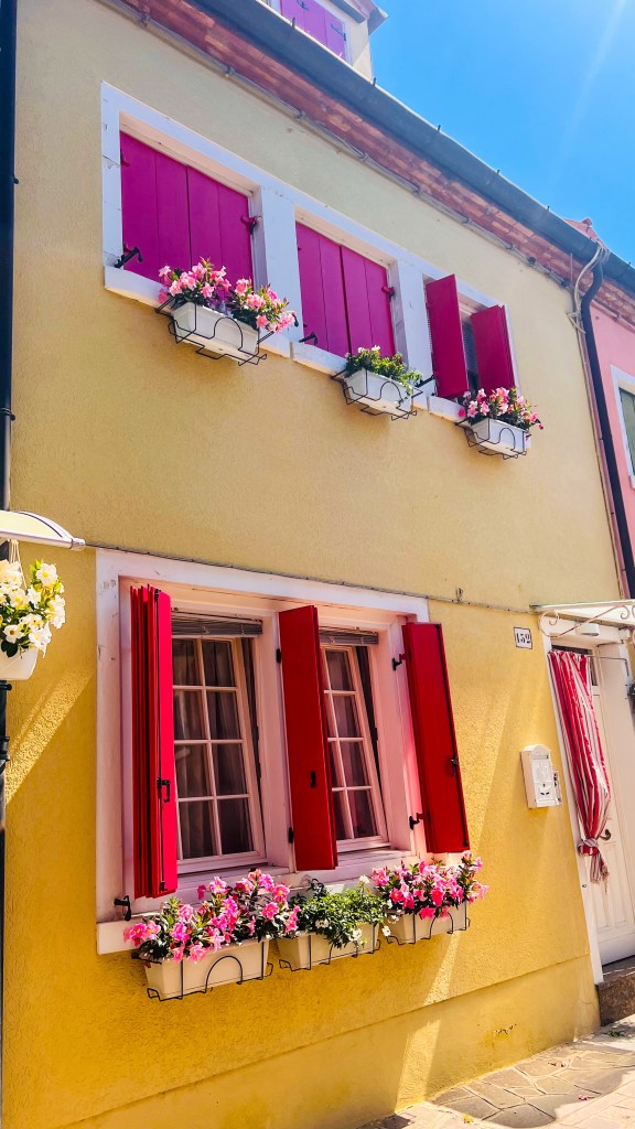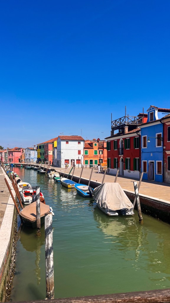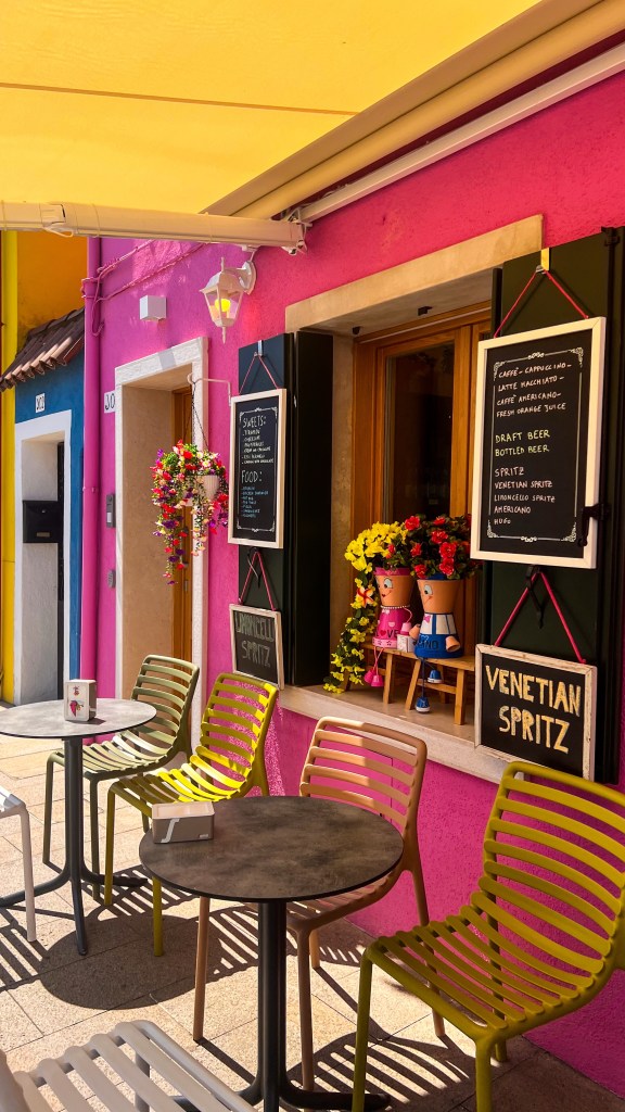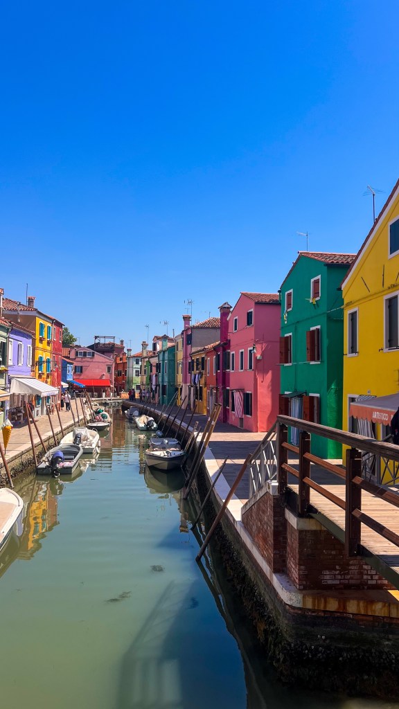 Ensuite départ de Murano Faro (attention il y’a beaucoup de stations / d’arrêts de bateau différents dans Murano). La ligne 12 qui permet d’aller à Burano part de la station Murano Faro. Le trajet dure entre 30/40 minutes, il n’était même pas 10h et il commençait déjà à avoir du monde (pas de pitié pour les placements dans le bateau). À Burano, on a pris un petit déjeuner immédiatement dans un café proche de la station de bateau. Ensuite on a flâné dans l’île c’est plus petit que Murano. C’est comme si un arc-en-ciel avait décidé de poser ses valises : impossible de ne pas mitrailler chaque façade colorée, le sourire aux lèvres (et la carte mémoire en sueur).