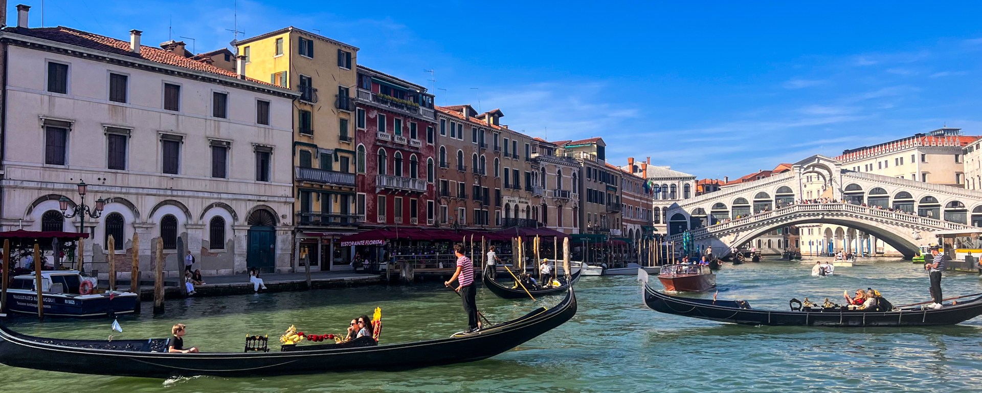 Après le Rialto, direction La place Saint Marc à quelques mètres, pas bondée de monde donc parfait. Ensuite direction la basilique Saint Marc juste à proximité . Nous y avons passé une bonne heure et demi puis avons repris le Vapoterro direction Piazzale de Roma, la ligne 1 est très adaptée pour voir et s’arrêter aux bons spots. Nous avons ensuite marché pour visiter une bonne partie dans le quartier Dorsoduro, on y trouve pas mal d’artistes et de galeries. Au détour de plusieurs chemins et sans plan préalable, juste se laisser porter, nous sommes ensuite revenus vers le grand canal, pont du Rialto. Nous avons déjeuné au Restaurant Florida, la vue est magnifique, une vue sur le pont du Rialto, pas mal de zone de départ de gondole.