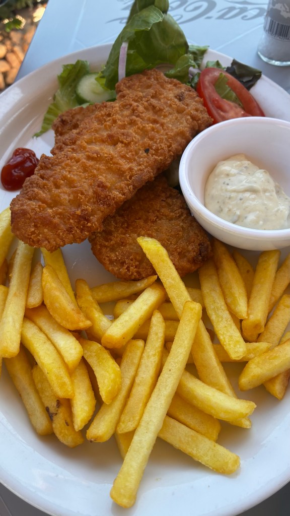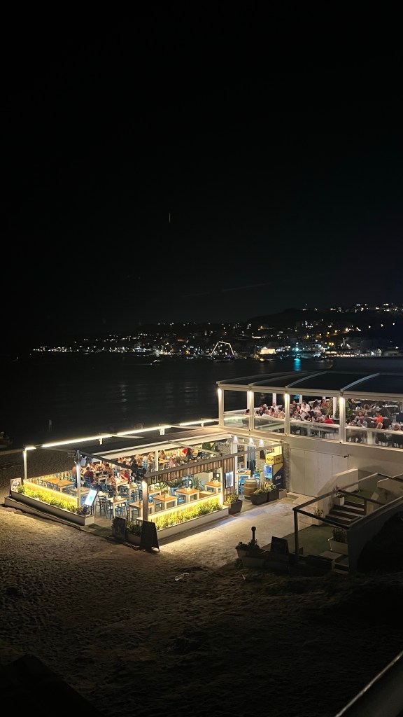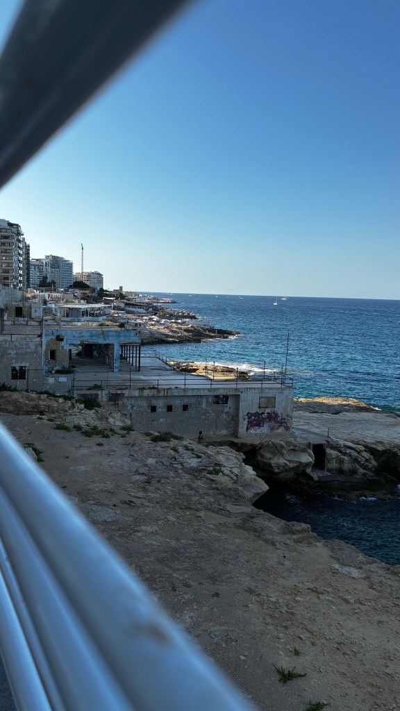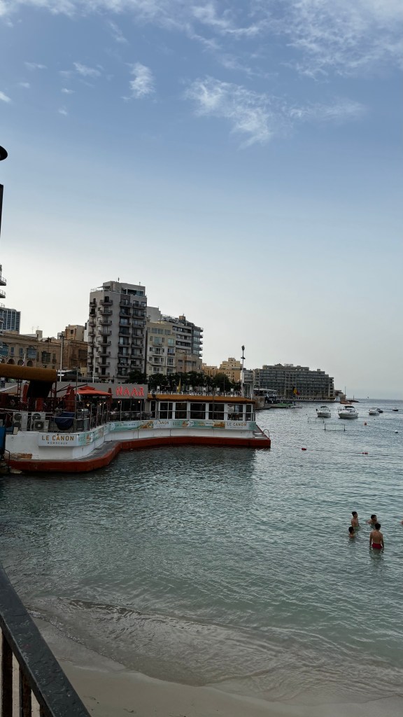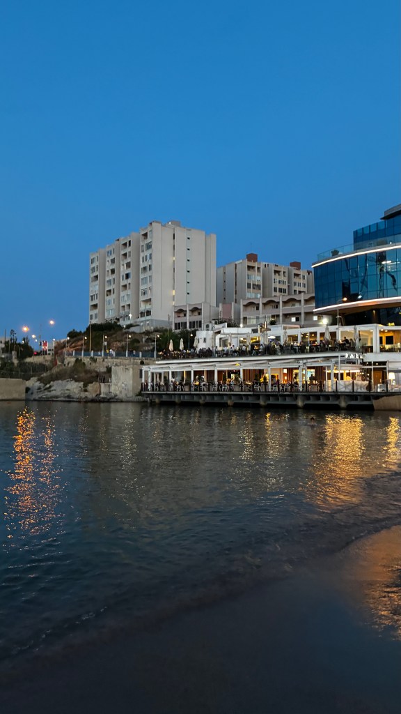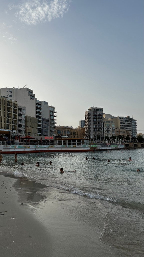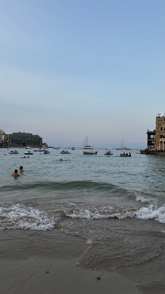 Après cette immersion culturelle, direction une pause plus balnéaire à Saint George’s Bay, à St Julian’s. C’est une plage urbaine, centrale et pratique, mais il faut être honnête : ce n’est pas l’endroit idéal pour se détendre en famille. Entre les travaux visibles aux alentours, les déchets (cigarettes, canettes) et les jeunes qui fument même dans l’eau, l’ambiance est loin d’être reposante. Nous y étions vers 18h : peu de monde, mais l’expérience reste celle d’une plage de dépannage, faite de mini-graviers plus que de sable. Les garçons se sont quand même amusés à barboter, mais clairement ce n’est pas une plage que je recommanderais pour une vraie journée détente. Le soir, nous avons dîné chez Open Waters, un grand restaurant face à la mer, avec écran géant diffusant le foot. Parfait compromis : les garçons ont pu suivre leur match pendant que je profitais de la vue et de l’ambiance animée.
