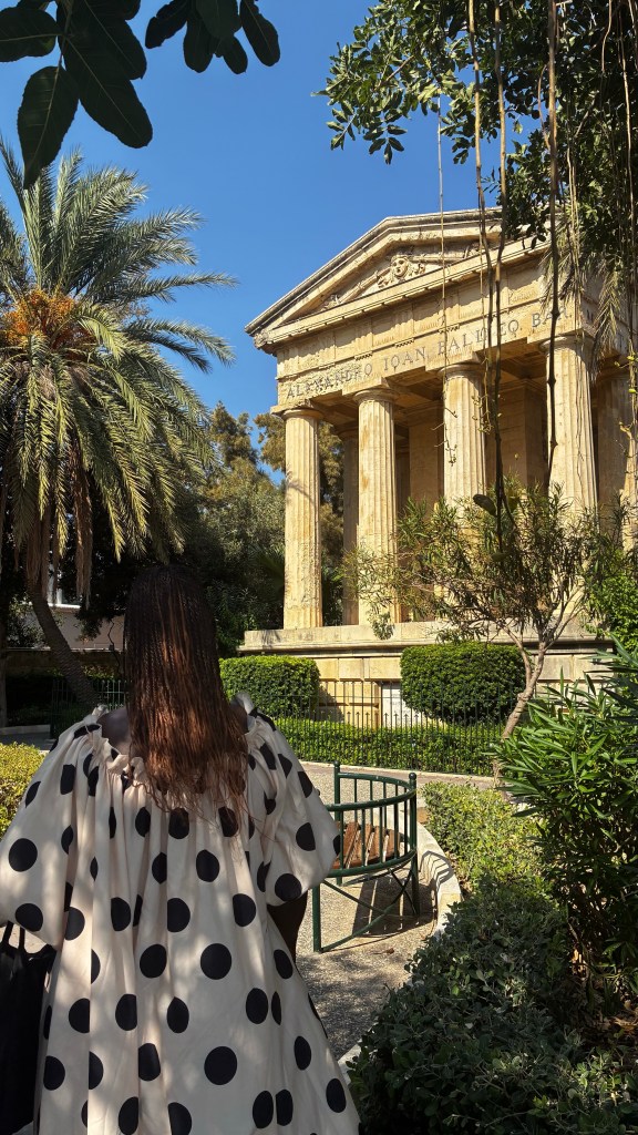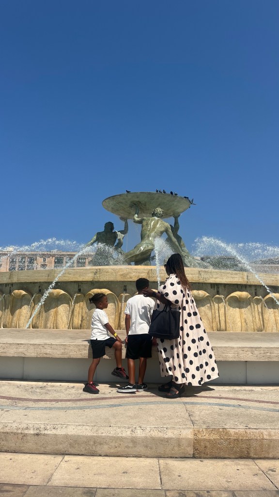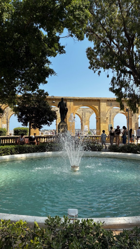 La journée a commencé doucement : un dernier plongeon à la piscine du Paradise Bay Resort avant de changer d’hôtel. Direction le Regency Hotel by NEU Collective à Il-Gżira, où bonne surprise, la chambre était déjà prête pour un check-in anticipé. On a pu se poser directement et repartir déjeuner chez Saigon, un restaurant asiatique à deux pas de l’hôtel – un vrai coup de cœur culinaire ! Ensuite, départ pour La Valette. En seulement 15-20 minutes de bus (2,50 € le ticket), on est arrivés au cœur de la capitale. La balade a commencé à la Fontaine des Tritons, grand point de repère à l’entrée de la ville. C’est une immense fontaine ornée de trois tritons en bronze, symbole d’accueil pour tous ceux qui arrivent à La Valette. Elle fait aussi office de rendez-vous pratique pour les locaux comme pour les touristes.