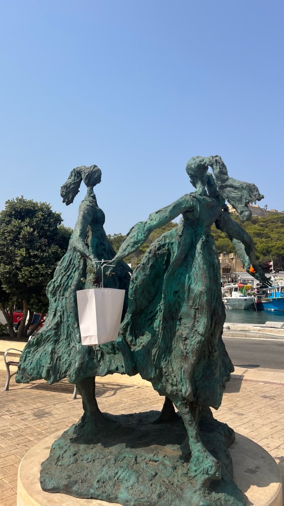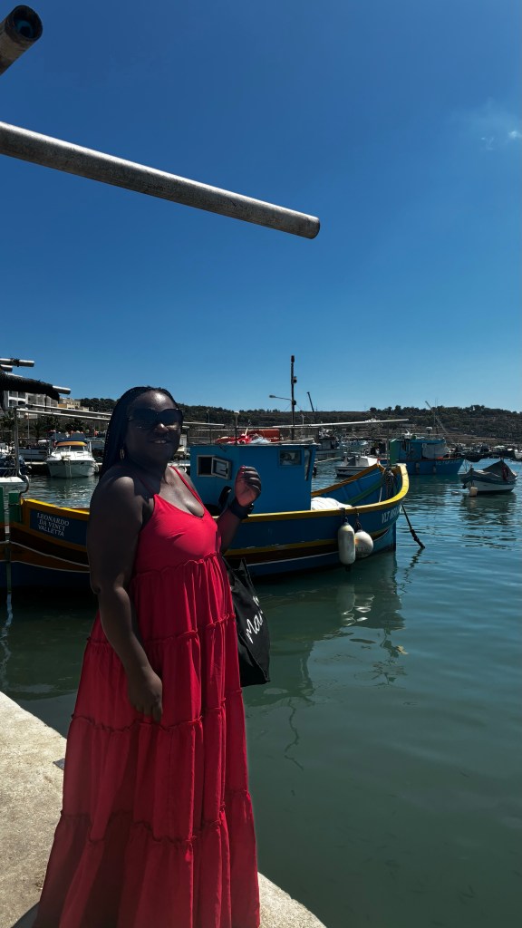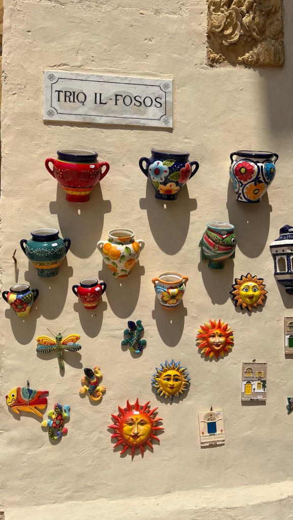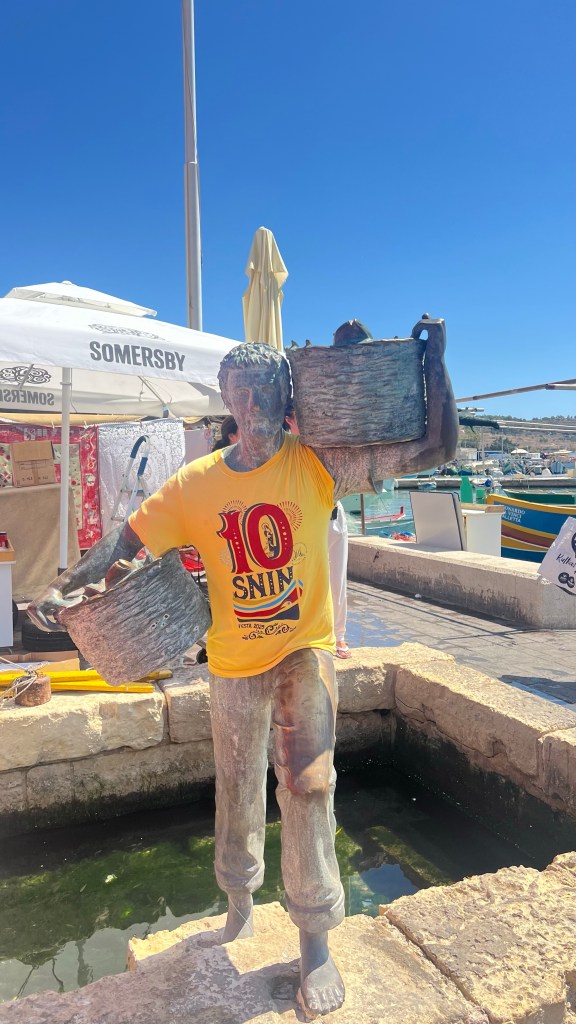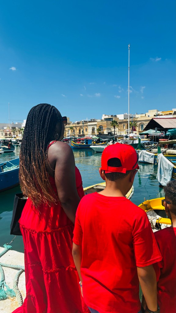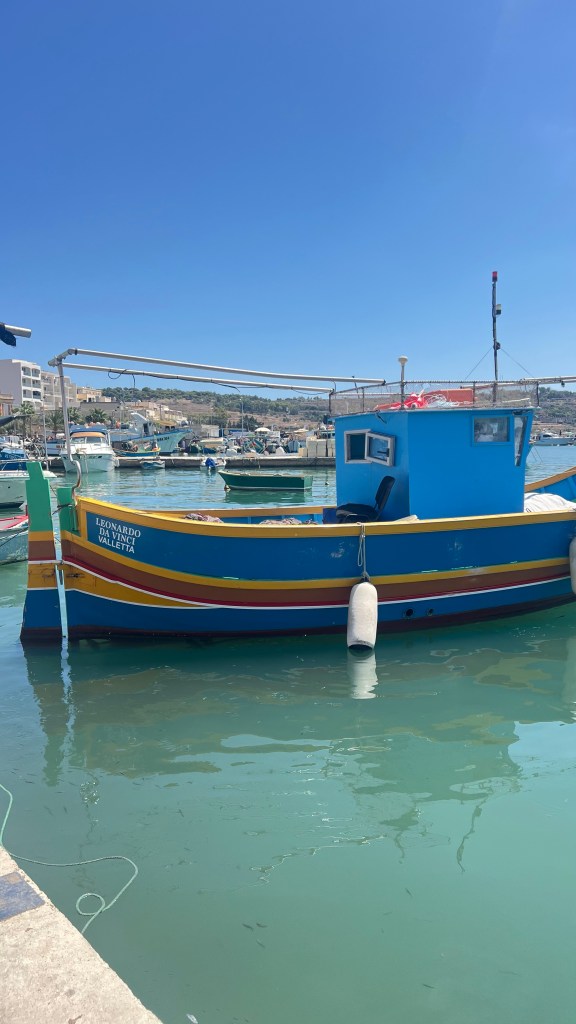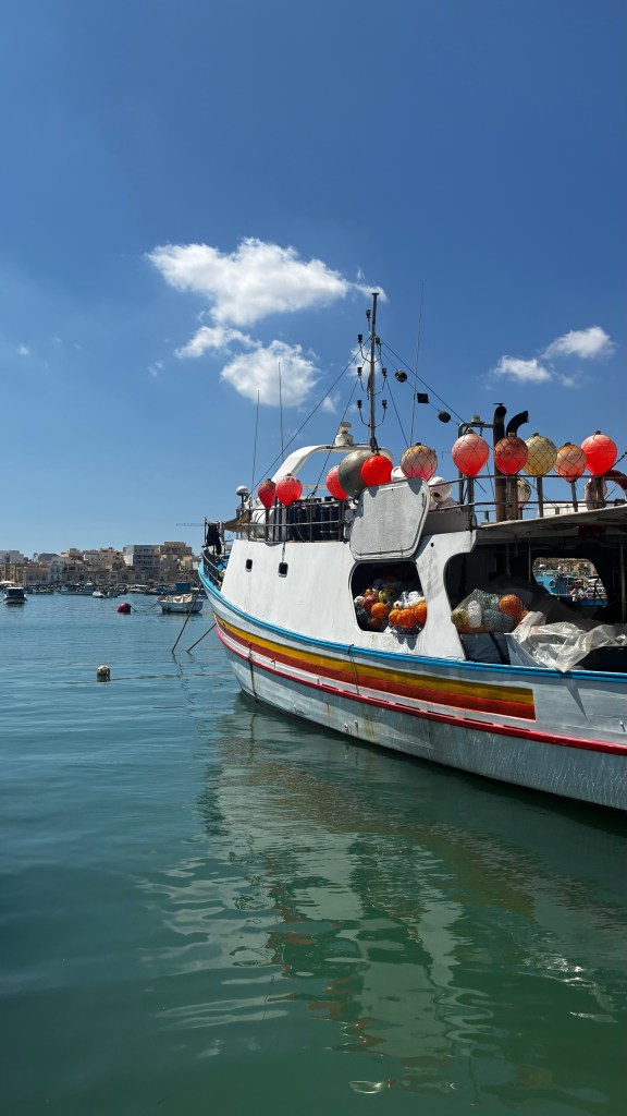 Ce matin, direction Marsaxlokk, le village de pêcheurs le plus pittoresque de Malte. Dès l’arrivée, impossible de ne pas tomber sous le charme des barques colorées, les fameux luzzu, flottant fièrement sur l’eau. Les enfants étaient fascinés : pour eux, c’était presque un concours de “qui trouvera la barque la plus colorée”. Les yeux protecteurs peints sur la proue semblaient raconter des histoires, et moi j’ai savouré cet instant : la simplicité, la mer, l’authenticité. Nous avons déjeuné sur place, installé face au port. Un moment tranquille, avec du poisson frais et une ambiance typiquement méditerranéenne, où tout semble aller à son rythme. Flâner un peu sur le marché a complété la matinée : entre fruits, épices et souvenirs artisanaux, c’est le genre d’escale qui marque un voyage.
