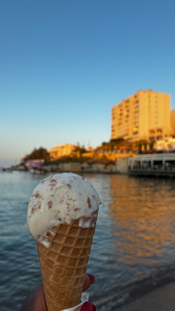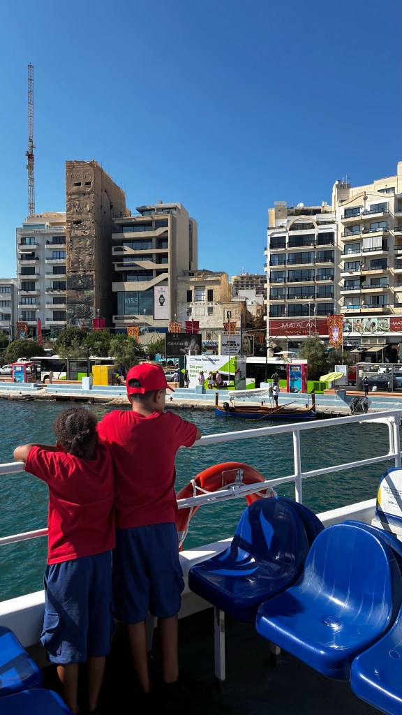 L’après-midi, nous avons repris le bus pour rejoindre La Valette. De là, nous avons choisi le ferry pour aller jusqu’à Sliema : 4 € seulement, une traversée rapide, et surtout une vue magnifique sur les remparts de la capitale. C’est une façon bien plus agréable d’arriver à Sliema que le bus, et ça donne l’impression de vivre une mini-aventure sur l’eau. À Sliema, nous avons profité du front de mer avant de filer au centre commercial The Point. Ce n’est pas le coin le plus dépaysant de Malte, mais pratique pour souffler un peu, se rafraîchir et faire du shopping. Les garçons étaient aux anges avec leurs nouveaux maillots de foot, et j’ai remarqué que certaines enseignes proposaient des collections différentes de la France, même chez Kiabi (une petite surprise qui donne envie de fouiller davantage).