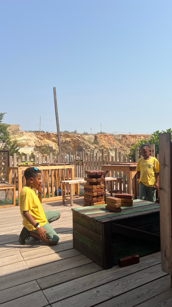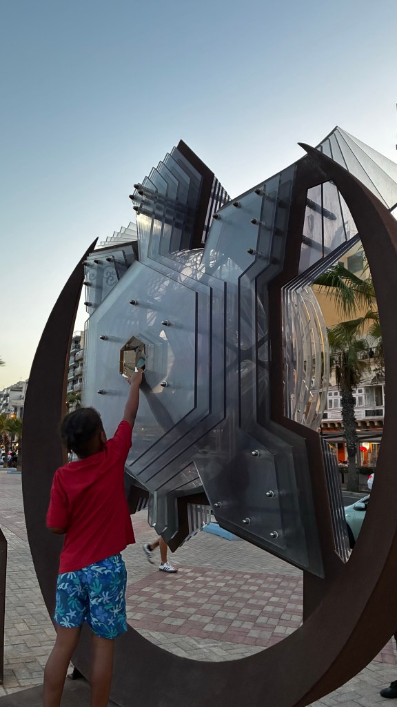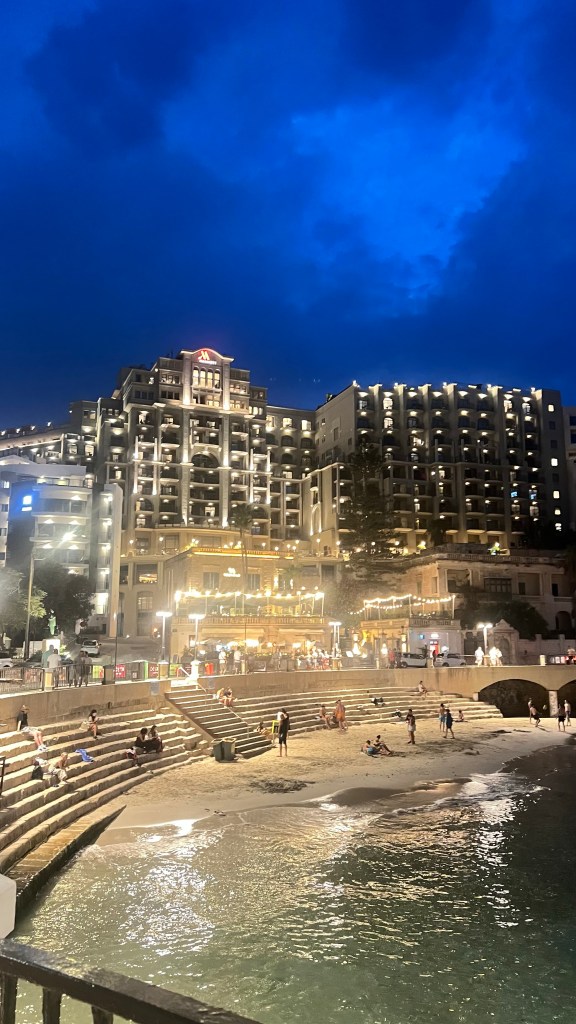 En fin de journée, vers 18h, nous avons filé à Balluta Bay Beach. Cette petite plage n’a rien à voir avec celle de la veille : pas de grues ni de bruit de chantier, juste une atmosphère paisible. La plage est modeste mais parfaite pour les enfants : ils se sont régalés à construire des châteaux de sable. Ce qui m’a surprise et amusée, c’est cette sorte d’estrade en pierre à plusieurs niveaux, un peu comme dans un stade de foot : pratique si on préfère s’asseoir au sec plutôt que de s’installer directement sur le sable.