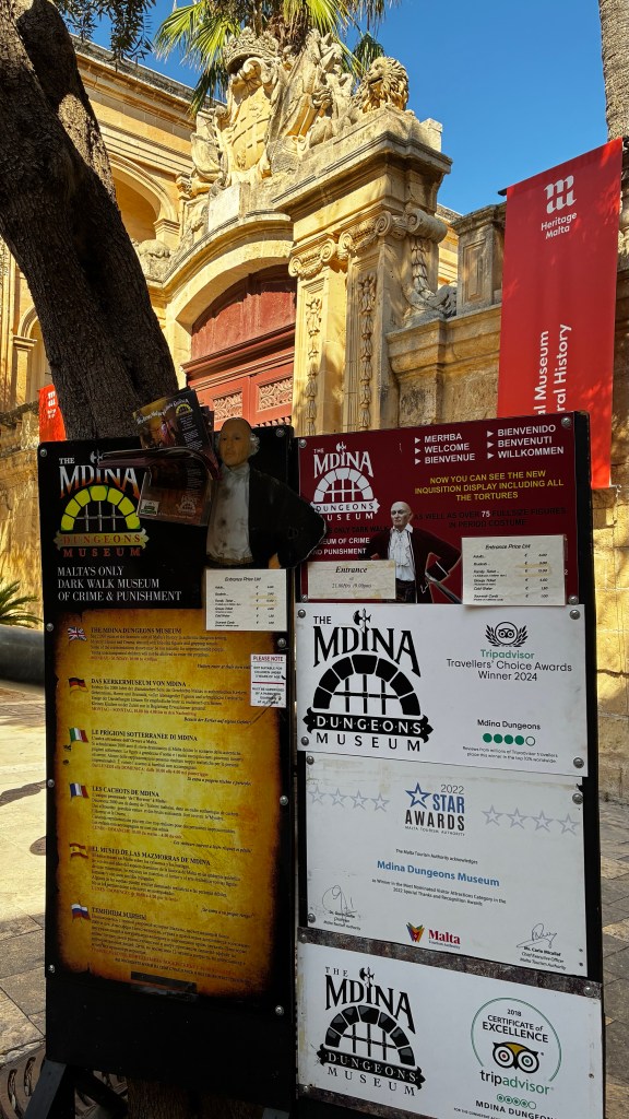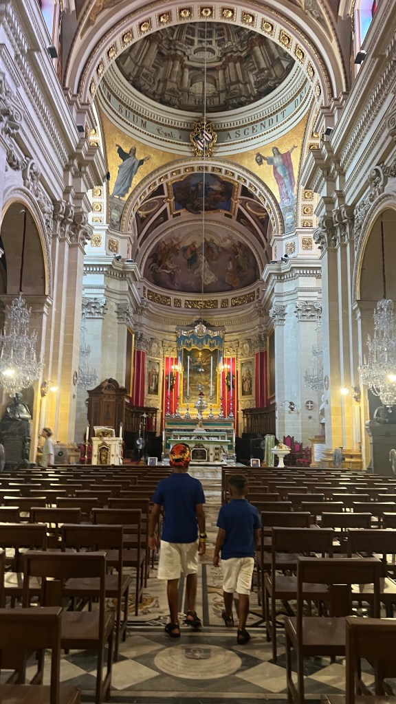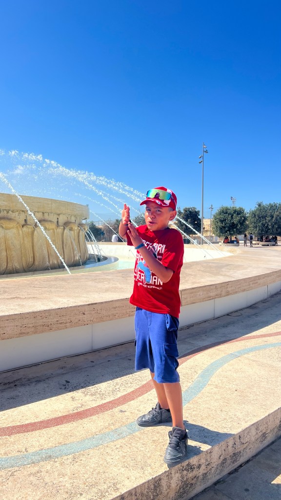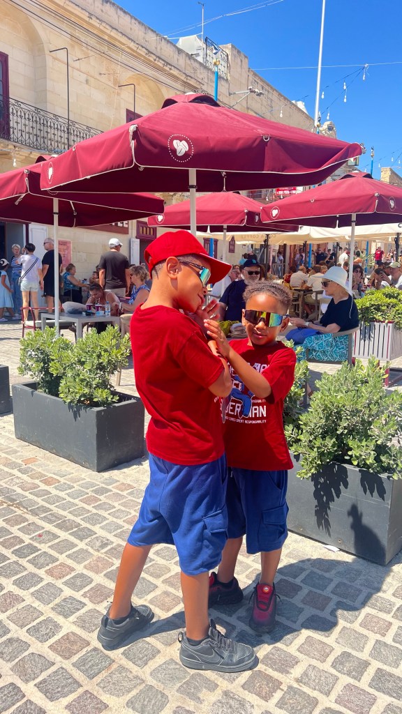Pour cette cinquième journée, nous avons mis le cap sur Mdina, l’ancienne capitale de Malte, surnommée la Cité du Silence. Rien que l’arrivée est magique : remparts imposants, portes majestueuses, ambiance hors du temps. Les garçons ont adoré se faufiler dans les ruelles étroites et découvrir les petites placettes où chaque coin semble figé dans l’histoire. Nous avons flâné au gré des rues, admiré les balcons fleuris et profité de la fraîcheur bienvenue de cette ville médiévale. Pause incontournable : le panorama depuis les remparts, qui offre une vue incroyable sur toute l’île. Petit conseil: prévois de bonnes chaussures, car ça grimpe pas mal dans Mdina et dans Rabat, juste à côté.