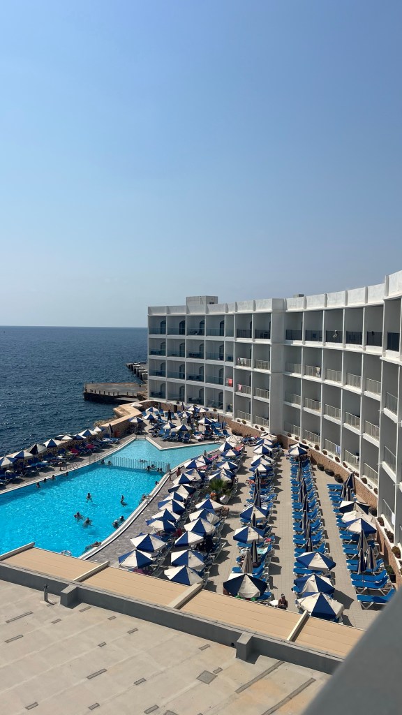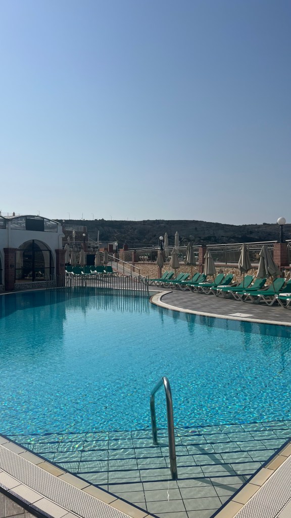 Hôtel 1 : Paradise Bay (20/08 au 23/08) – 581,50 €: Situé tout au nord de l’île, il offre un accès idéal à Popeye Village, aux grandes plages familiales comme Mellieħa Bay, et surtout au départ des croisières vers Gozo et Comino. L’hôtel dispose d’une piscine, parfaite pour commencer les journées tranquillement avec les enfants avant de partir en exploration. Ici on a plutôt fonctionné en bolt/Uber c’est plus pratique, marcher ne l’était pas et avec les bus un peu plus de perte de temps avec une moyenne de 10€ par trajet sachant que le bus coûte 2,5€ par personne.